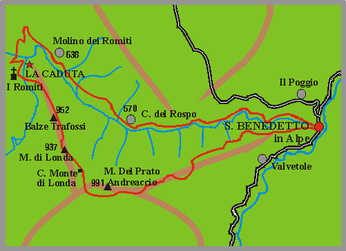 Dal piazzale/parcheggio di S. Benedetto in Alpe si ritorna sulla Statale prendendola a destra e superando il ponte sul Fosso Acqua Cheta. Subito dopo, a destra, alcune scalette portano ad un piccola cappella e ad un evidente sentiero che corre lungo il torrente, sulla sua destra orografica. Il sentiero un tempo era stato segnalato dal CAI e le tacche bianco/rosse, anche se molto scolorite, possono essere ugualmente utili. Percorse alcune centinaia di metri lungo la sponda del corso d'acqua si giunge ad un bivio. Qui si va a sinistra, in salita, lasciando il torrente e affrontando un primo tratto in forte ascesa. Il sentiero si porta quindi nei pressi di una piccola frana che, però, non attraversa, ma bensì aggira dall'alto. Sempre all'interno del bosco di castagni ci si mantiene in costa continuando comunque a guadagnare quota e giungendo ad un piccolo pianoro caratterizzato da alcune secolari piante di castagno. Da qui il sentiero taglia ancora per un breve tratto il versante per poi iniziare a inerpicarsi su uno dei crinali che scende dal Monte del Prato Andreaccio. Il castagno, a poco a poco, sta lasciando il posto al faggio di cui sono visibili alcuni esemplari colonnari. Raggiunto un evidente punto di valico si pongono due alternative per raggiungere le Case Monte di Londa. La prima, non segnalata, prevede di seguire il filo di cresta superando la cima del Prato Andreaccio e scendendo poi alle succitate case. La seconda, malamente segnalata (tacche bianco/rosse molto scolorite) prevede invece di tagliare i fianchi settentrionali del monte lungo la via più battuta che conduce alle Case Pian della Posta, in stato di abbandono. Da qui ci si immette su una mulattiera che senza grandi strappi porta al grande anfiteatro erboso su cui sorgono le Case Monte di Londa, anch'esse, purtroppo, abbandonate. Raggiunte quest'utime la mulattiera piega a sinistra, andando a tagliare il fianco occidentale del Monte di Londa. Particolare attenzione va posta dopo poche centinaia di metri, ad un bivio. Qui, infatti, va lasciata la mulattiera principale per prendere, a destra, il sentiero che si porta sul lato orientale delle Balze Trafossi (utili, in questo caso, i segnali CAI). Da qui in poi il sentiero inizia a scendere decisamente toccando la casa diroccata del Sodaccio eraggiungendo poi il Fosso Acqua Cheta. Senza superarlo si continua a destra fino ad arrivare ad un facile guado dove si supera il corso d'acqua portandosi poi sui lisci strati di arenaria che precedono l'arrivo al salto principale della cascata. Da qui si torna indietro, tenendosi sempre sulla sinistra orografica del torrente e arrivando al pianoro erboso dei Romiti, dove sorgono, su unapiccola altura, i ruderi di un convento. Il pianoro non vaattraversato ma bisogna mantenersi sul suo lato destro, inserendosi sull'antica mulattiera che scende andando a superare il Fosso Cà del Vento proprio sotto ad una fragorosa cascata. Dal fosso si continua sulla mulattiera principale ed in breve si giunge ad un balcone naturale da cui appare, in tutto il suo sviluppo, la Cascata dell'Acqua Cheta. Da qui si continua sulla mulattiera che corre sulla sinistra orografica della valle, via che non presenta alcun problema di orientamento essendo ben segnata e molto battuta da escursionisti toscani ed emiliani. Lungo questa si ha modo, più volte, di portarsi sulle sponde del torrente caratterizzato da brevi salti rocciosi e da piccole, fresche piscine naturali. La mulattiera confluisce, infine, sulla strada asfaltata S.Benedetto-Marradi che, presa a destra, scende alla località di partenza.